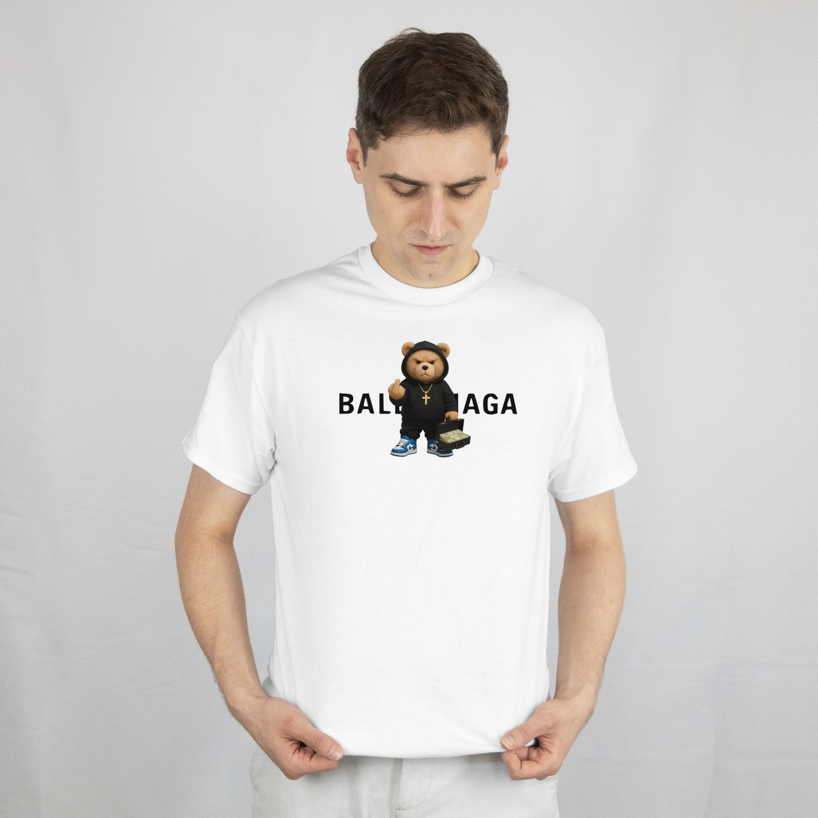 Tricou din bumbac pentru bărbați, de culoare albă, cu design grafic inspirat din stilul streetwear. Imprimeul cu urs oferă un aspect modern și relaxat, ideal pentru outfituri urbane.