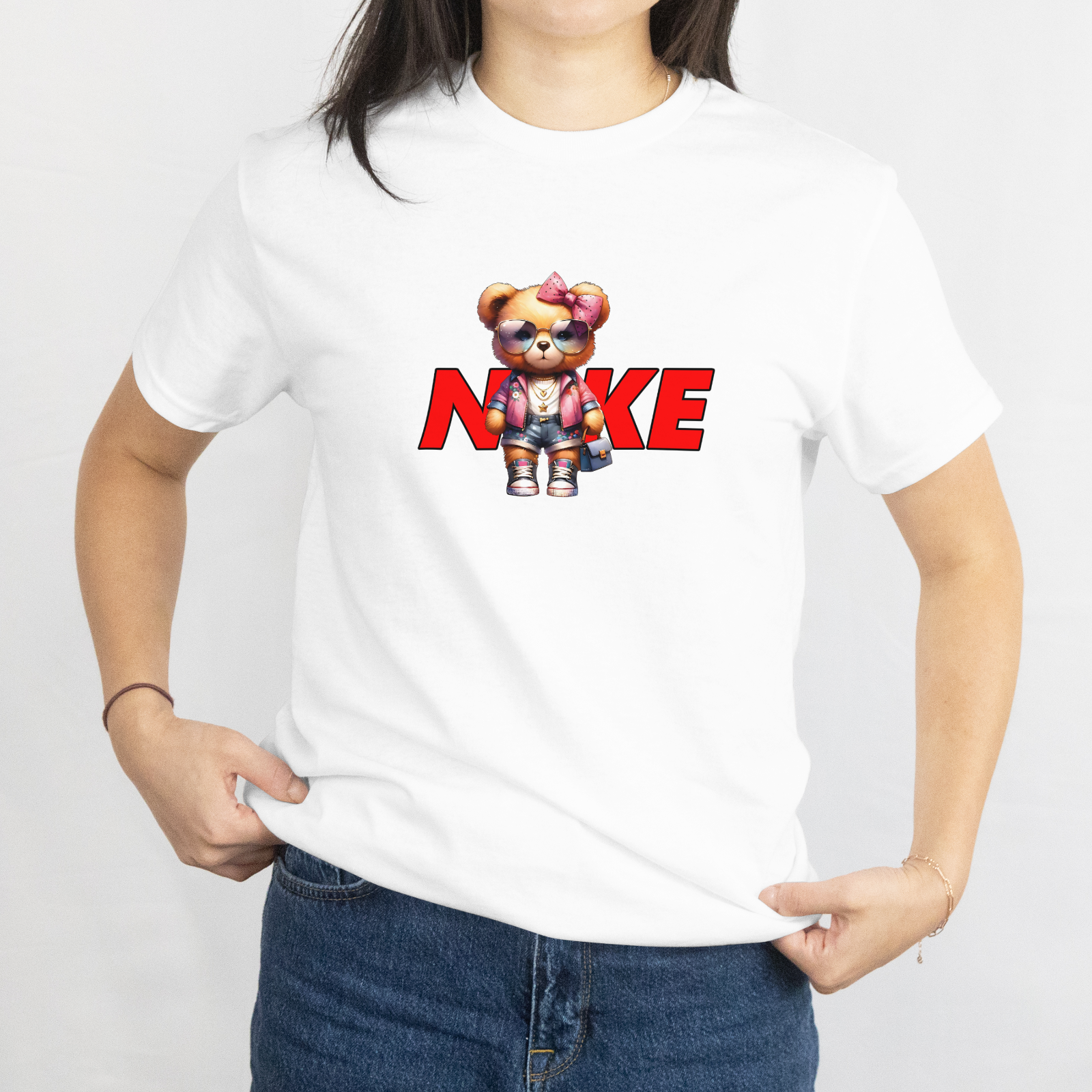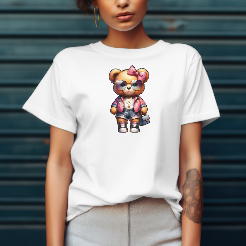 Tricou alb pentru femei, confecționat din bumbac, cu imprimeu frontal ce reprezintă un urs într-un stil urban modern. Un model simplu și confortabil, ușor de asortat.